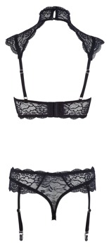 Sensual underwired bra made out of floral lace with decorative rings and adjustable straps in the cleavage area. The adjustable bra straps have beautiful lace details that go over the collarbone and connect to a wide collar. With hook fastener at the back and 2 buttons on the collar. The included lace string has adjustable and removable suspender straps.