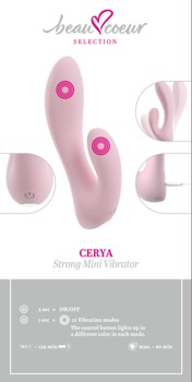 De sensueel gebogen CERYA Strong minivibrator van beau cœur verwent met zijn twee armen tegelijkertijd de vagina en de clitoris. Zijn extra krachtige vibraties gaan echt diep, onder de huid en recht op het doel af. Met 10 verschillende vibratiestanden is er voor elke stemming en elk hoogtepunt de juiste snelheid. Druk gewoon op de knop. Het perfecte speeltje om kennis te maken met dubbele stimulatie en meerdere orgasmes!