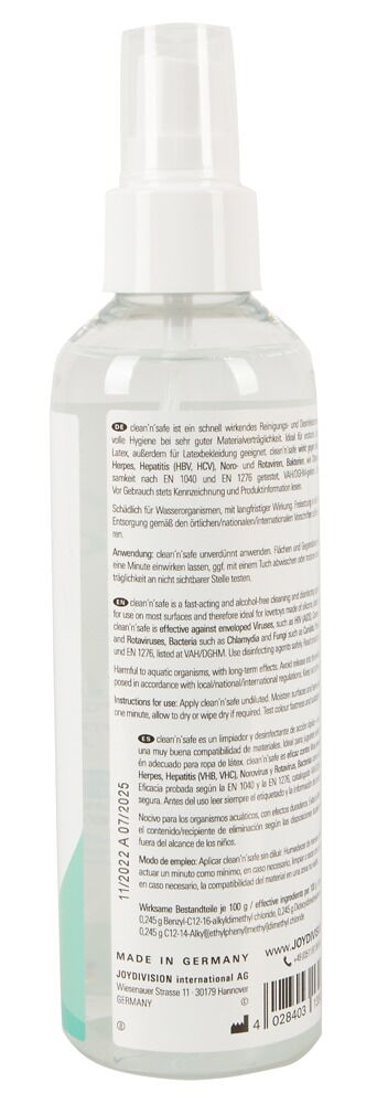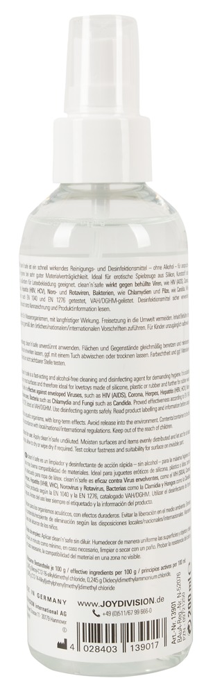Universeller Toycleaner clean'n'safe für Erotikspielzeug aller Art. Anwendbar auf Materialien aus Gummi und Latex, Silikon, PVC sowie Plastik. Alkoholfrei, eiweißlösend. Parfümfrei. Dermatologisch getestet. 200 ml.