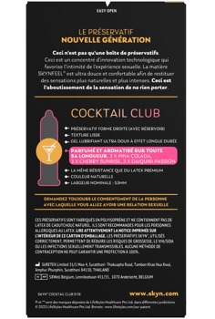 Mieszanka prezerwatyw Cocktail Club od SKYN z 9 ultracienkimi prezerwatywami w 3 różnych odmianach smakowych i zapachowych: 3 x Pina Colada, 3 x Cherry Sunrise, 3 x Passion Daiquiri.
