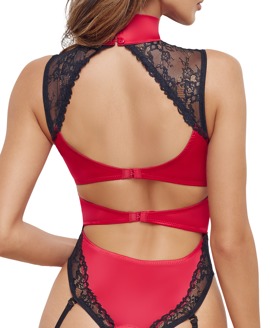 Utrolig sanselig body m/strømpestropper fra Cottelli LINGERIE i edel rød sateng med innsatser av edel svart blonde. Det myke, elastiske stoffet føles svært behagelig mot huden. Stilig form med halsbånd til å knyte i sateng, blonde på skuldre og stort cutout i utringingen. Ryggen er nesten fri, kun med to hektelukkinger. To stretchstropper gjennom skrittets franske åpning. Juster- og avtagbare strømpestropper.