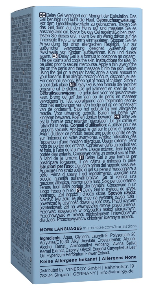 Delay Gel fra Mister Size hjælper mænd med at forlænge deres seksuelle nydelse uden at skulle gå på kompromis med spontanitet eller følelse. Delay Gel kombinerer effektive, naturlige ingredienser med en hudvenlig formel. Nellikeolie og laureth-9 kan reducere følsomheden og forsinke klimaks. Samtidig giver en let kølende effekt ekstra kontrol, mens perikon og havreekstrakt beroliger huden. Den lette delay-gel kan påføres hurtigt og målrettet og masseres let ind. Den er kompatibel med kondomer og legetøj.