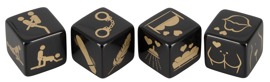 A set of 4 black acrylic dice (25 x 25 x 25 mm) with gold-coloured pictures on them. The pictures are of a position, a place, an accessory and a body part.