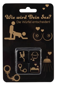 4 dados acrílicos negros (25 x 25 x 25 mm) con impresión de motivos en color dorado en el juego: posiciones, ubicaciones, accesorios y regiones del cuerpo.