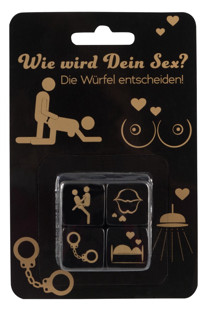 4 svarta tärningar (25 x 25 x 25 mm) med guldfärgat tryck. Motiv "Ställningar", "Plats", "Tillbehör" och "Kroppsregion".