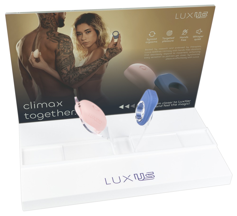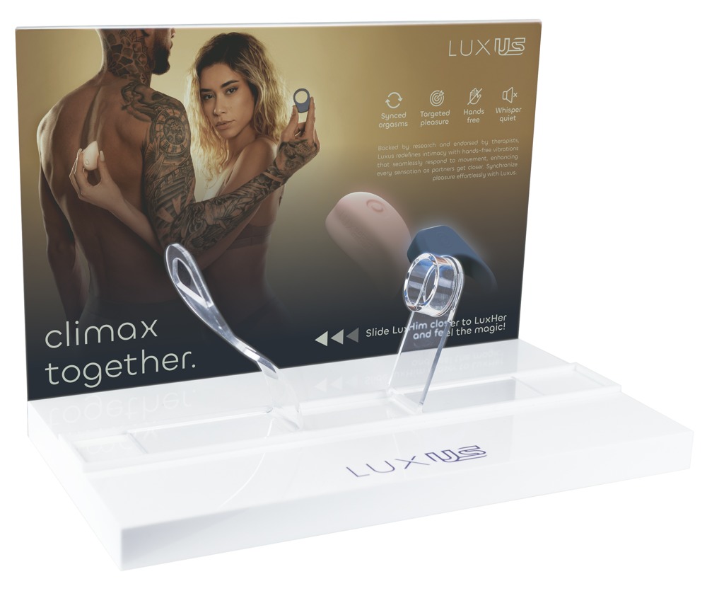 Advertise the couple's toy set LuxUs from Kiiroo in a great way with this high-quality display. The display will also make customers want to try out the products as well.