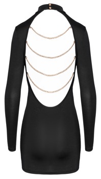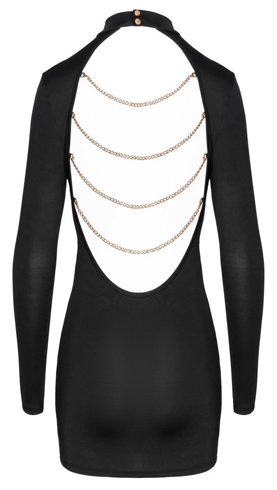 This black mini dress from Cottelli PARTY has long sleeves and is in a tight-fitting design. It has a large breathtaking cut-out at the back with 4 gold-coloured chains over the uncovered back. The chains can be removed. The stand-up collar can be fastened with its 2 gold-coloured press studs at the back of the neck. The delicate stretchy material is soft and clings sexily to the body, making it comfortable to wear and move about in.