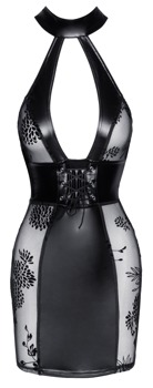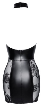 A short, tight-fitting dress Fucking Fabulous from Noir with a halterneck choker. There is a large cut-out in the cleavage area and waist-emphasising lacing underneath. The top of the back is uncovered. There is a zip at the bottom of the back so that it can be put on and taken off easily. The dress is made out of stylish matte look material and there is transparent material at the sides that are covered in velvet flock print. The transparent material clings to the body and feels very comfortable to wear.
