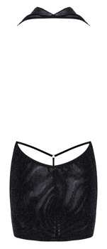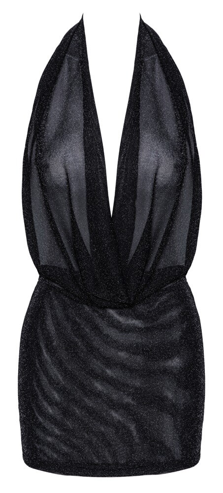 The halterneck mini dress Orgia Luminara from Noir has a breathtaking cowl neck. There are thin decorative straps at the back of the backless dress for a secure fit. It is made out of slightly transparent black material with a beautiful but subtle silver shimmer. It is also soft and stretchy for a very comfortable fit.