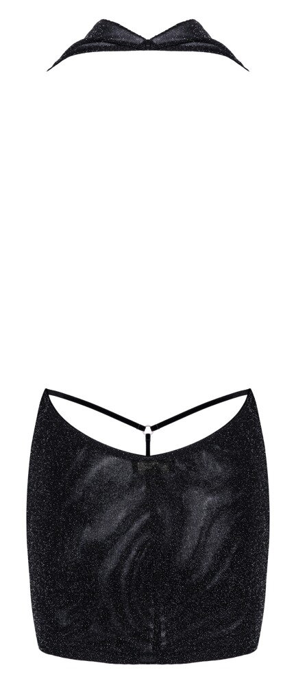 Minivestido Orgia Luminara de Noir con escote en cascada. Espalda abierta con estrechos tirantes decorativos para un ajuste seguro. En negro semitransparente con sutiles reflejos plateados. Elástico y suave al tacto para un máximo confort y facilidad de movimiento.