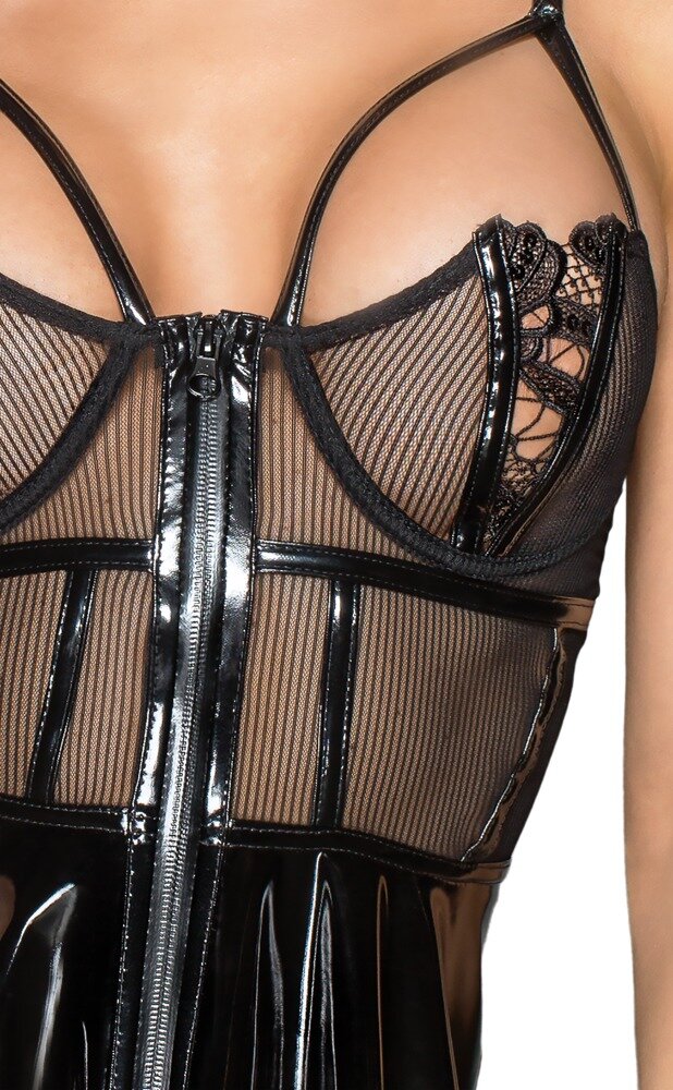 Halvgjennomsiktig, stripete bustierkjole med formbøyler, justerbare stropper i lakk og pyntebånd i utringingen. Med kort utsvingt skjørtdel i glinsende lakk. Edelt broderi på skålene, pyntestriper i lakk og gjennomgående glidelås foran. Utrolig sexy stil!