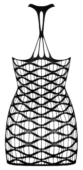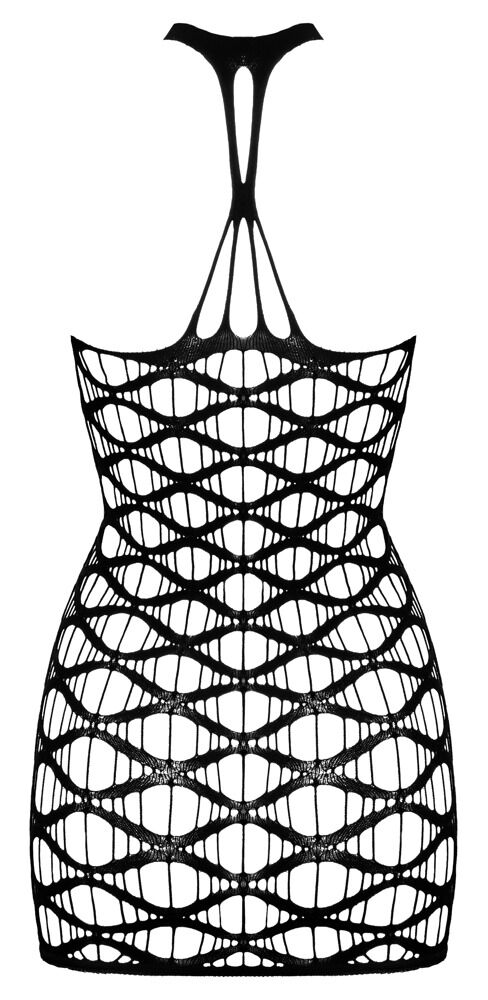 Rozbudza fantazje: krótka sukienka z odkrytymi ramionami Cottelli FANTASY z ekstrawaganckiej siateczki i wstążki z dużymi oczkami. Całość wykonana bezszwowo i pięknie miękka i elastyczna dla wysokiego komfortu noszenia. W zestawie pasujące małe stringi wykonane z koronki.