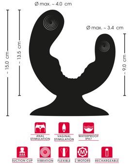 Elastyczna zabawka jest idealna do jednoczesnej stymulacji pochwy i odbytu. Delikatne rowki stymulujące ocierają się o wrażliwe krocze i intensyfikują doznania. Podwójny wibrator może jednocześnie pieścić pochwę i łechtaczkę - lub włożony analnie, krocze i jądra cieszą się dodatkowym masażem. Może być również używany w strap-onach do ekscytującej zabawy we dwoje. Całkowicie wodoodporny, podwójny wibrator nadaje się również do zabawy w wannie i pod prysznicem. Wszechstronny wibrator do zabaw solo i miłosnych!