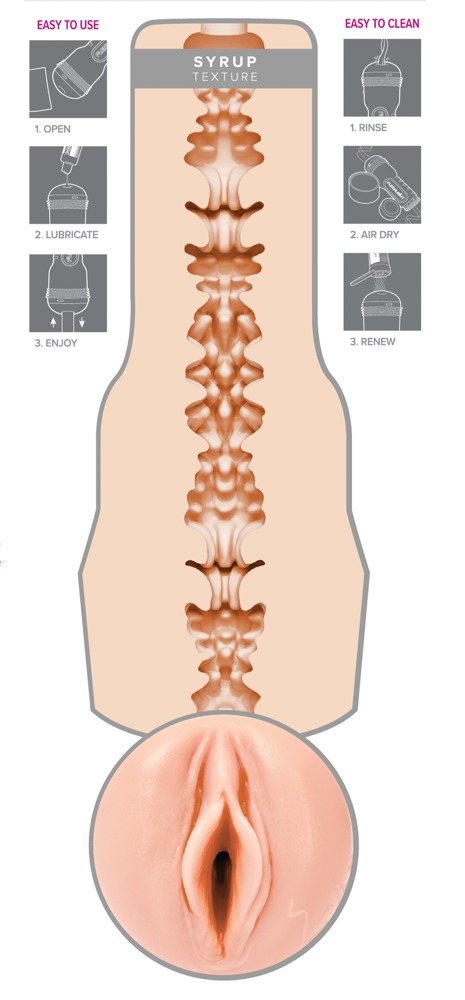 Удобный мастурбатор Emma Hix Syrup от Fleshlight в сдержанном факельном виде с оригинальным формованным отверстием вагины от звезды эротики Эммы Хикс. Внутренняя часть с разнообразной структурой и разными диаметрами очень плотно прилегает к тугому влагалищу Эммы и обеспечивает интенсивный оргазмический массаж во время хэндджоба. Внутренняя втулка из мягкого материала Superskin, напоминающего кожу, снабжена автографом Эммы рядом с отверстием и легко снимается с мастурбатора для очистки.