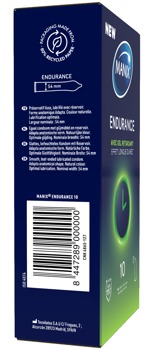 The lubricated condoms, Endurance from MANIX, are great for longer-lasting sex because they have delay gel inside (contains 4.5% Benzocaine). The condoms can reduce sensitivity and therefore prolong the duration of an erection for enduring lovemaking. Cylindrical shape. Teat-ended.