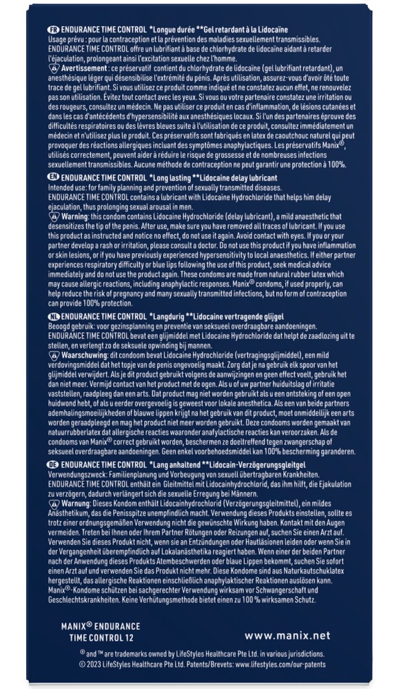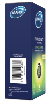 Przedłużające działanie, wilgotne prezerwatywy Endurance Time Control firmy MANIX pokryte od wewnątrz żelem opóźniającym lidokainę. Mogą zmniejszyć wrażliwość, a tym samym wydłużyć czas trwania erekcji, zapewniając długotrwałą miłość. Cylindryczny kształt ze zbiorniczkiem.