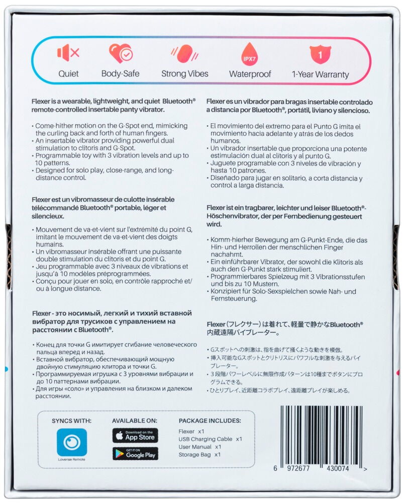 The ergonomically-shaped Bluetooth Insertable Dual Panty Vibrator Flexer from Lovense vibrates in the vagina and on the clitoris. The insertable vibrating arm also fingers the G-spot with rhythmic pressure using back-and-forth movements. It is quiet and discreet, which makes it perfect for pleasure at home or on the go. It is flexible for a perfect fit and made out of velvety soft silicone for maximum comfort. It is waterproof – it's therefore also a great companion in the bath or the shower.