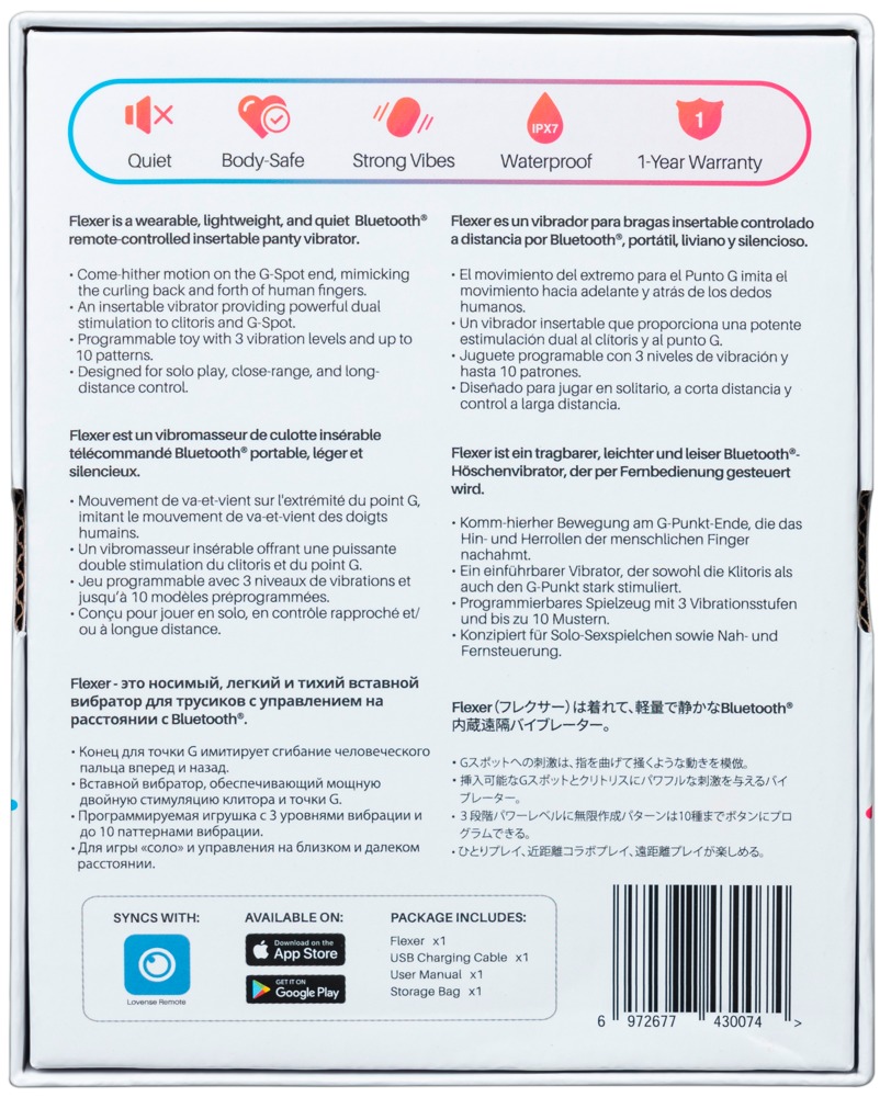 Ergonomisk formet Bluetooth Insertable Dual Panty Vibrator Flexer fra Lovense. Vibrerer i vagina og mot klitoris samtidig. I tillegg fingrer den innførbare vibroarmen G-sona med fram- og tilbakebevegelser med rytmisk press. Stillegående og diskret, perfekt å bruke hjemme og underveis. Flexer er deilig fleksibel og i smidigs silikon for perfekt passform. Flexer er i tillegg vanntett og kan gjerne nytes i badekar eller dusj.