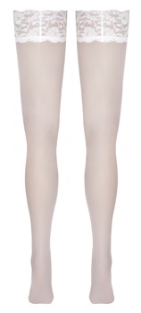 White hold-up stockings by Cottelli LEGWARE with beautiful 9 cm wide lace trim. Silicone reinforcement on the inside for a non-slip fit and perfect support. Yarn weight 20 den. Oeko-Tex certified.