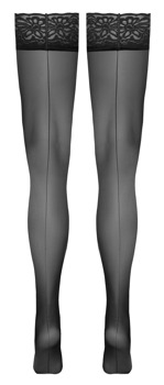Svarta stayup-strumpor från Cottelli LEGWARE med snygg söm baktill och 8 cm bred spetskant med silikonförstärkning invändigt som gör att strumporna sitter bra och inte halkar ner. 20den. Oeko-tex certifierade.