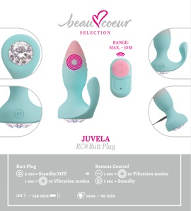 Der pastellig frische JUVELA RC Butt Plug von beau cœur verwöhnt die anale Region von innen und außen zugleich. Der geriffelte Plug und der Außen-Stimulator überraschen dabei mit intensiven Vibrationen gleich in 10 Modi – bequem per Fernbedienung steuerbar. Ganz leise und diskret liefern gleich 2 Motoren volle Kraft für den Rundum-Analspaß. Dabei darf Glamour nicht fehlen: Ein funkelnder Schmuckstein schmückt bei dem ganzen Spaß den Anus!