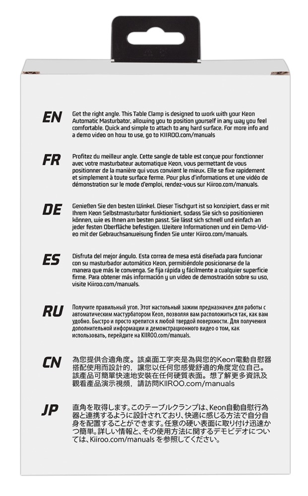 Praktyczny zacisk stołowy KEON firmy Kiiroo ustawia automatyczny masturbator KEON pod odpowiednim kątem, aby zapewnić zabawę w masturbację bez użycia rąk. Szybko i łatwo mocowany do każdego stałego (stołowego) blatu - KEON Automatic Masturbator jest następnie po prostu wciśnięty i trzyma się mocno i bezpiecznie dla w pełni automatycznej przyjemności pchania.