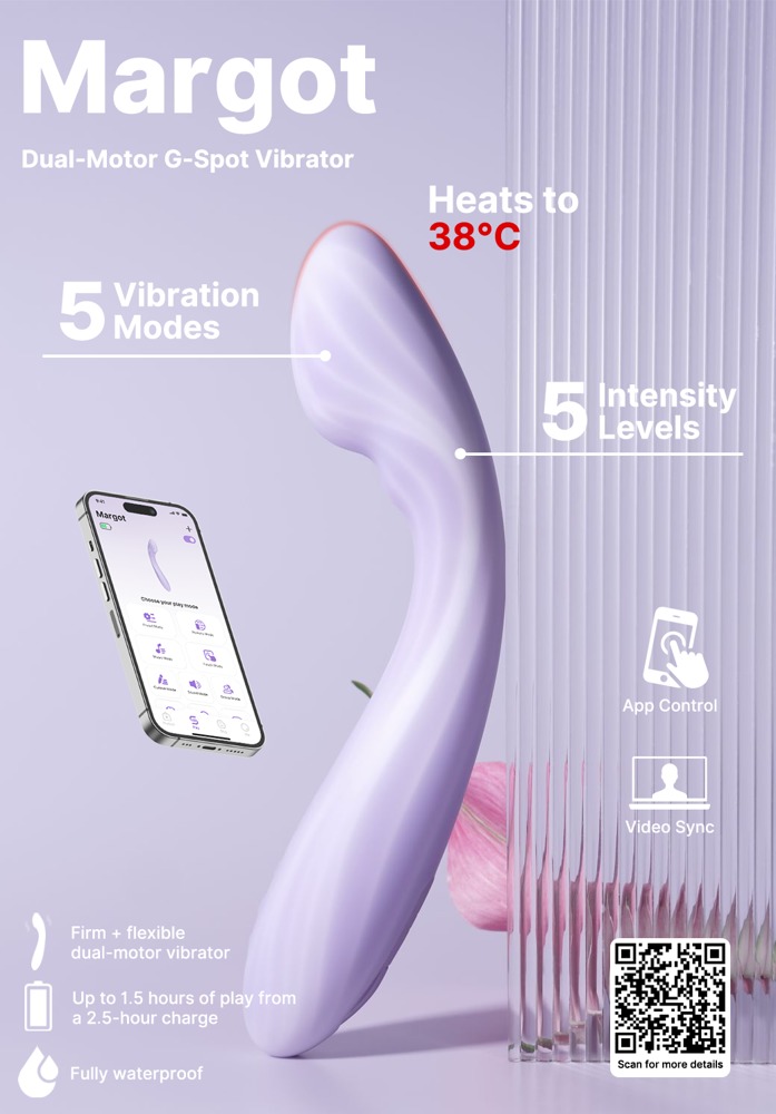 App-Controlled Dual Motor G-Spot Vibrator Margot fra SVAKOM. Ergonomisk perfekt buet og med et fladt hoved til målrettet stimulering af nydelsespunkter på indersiden og ydersiden af kroppen. Især G-zonen og klitoris nyder godt af en intensiv massage! Blide bølgestrukturer intensiverer også berøringen. Den bløde og silkeagtige dobbeltlags silikonevibrator glider som ved et trylleslag over huden og ind i intime dybder. Den forkæler dig med et enormt udvalg af vibrationer med et tryk på en knap. Den stilfulde letvægter kan nemt og spændende inkorporeres i enhver solo- eller kærlighedsleg. Selv i badet og under bruseren, for Margot er vandtæt.