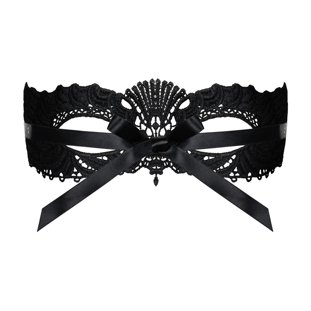 Elegant zwart oogmasker A700 van Obsessive gemaakt van fijn, zacht guipure kant. Met zijdezachte satijnen linten om vast te knopen - perfect aan te passen aan elke hoofdomtrek.