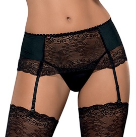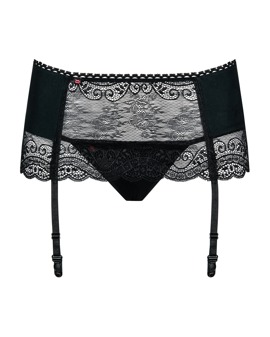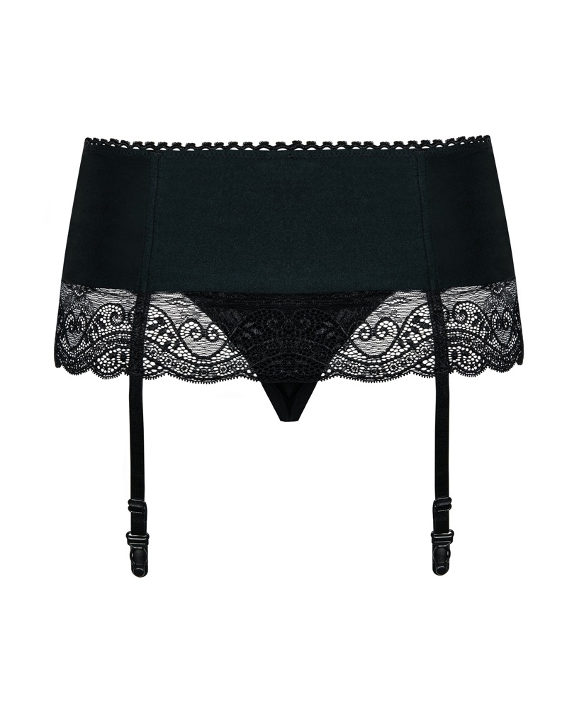 Bredt selebælte Miamor fra Obsessive i et materialemiks af stretchstof og fine blonder. Bæltestropperne er justerbare. Ensfarvet sort g-streng medfølger. Leveres uden strømper.