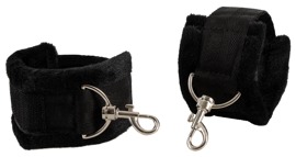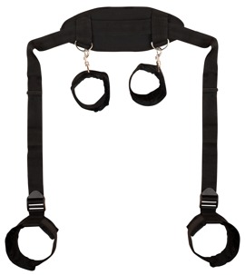 Combined restraint from Bad Kitty for the neck, wrists and ankles. The restraints are padded with soft plush and can be adjusted with the strong hook and loop fasteners for a perfect fit. The restraint straps that lead to the ankle cuffs can be adjusted. The wrist cuffs have snap hooks and can be removed from the neck restraint. Includes a blindfold.