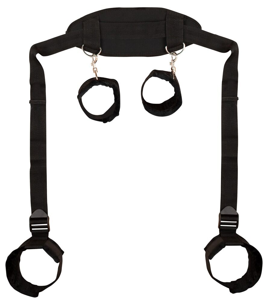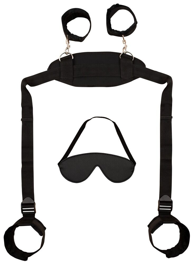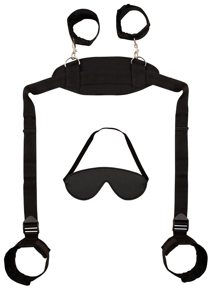 Комбинированный бондаж от Bad Kitty с участием шеи/затылка, рук и ног. Сдерживающие манжеты с внутренней стороны обшиты мягким плюшем и регулируются прочными застежками-липучками для идеальной посадки. Ограничительные ремни к манжетам на лодыжках регулируются по длине. Наручники отсоединяются от шейной манжеты с помощью карабинов. Маска для глаз входит в комплект.