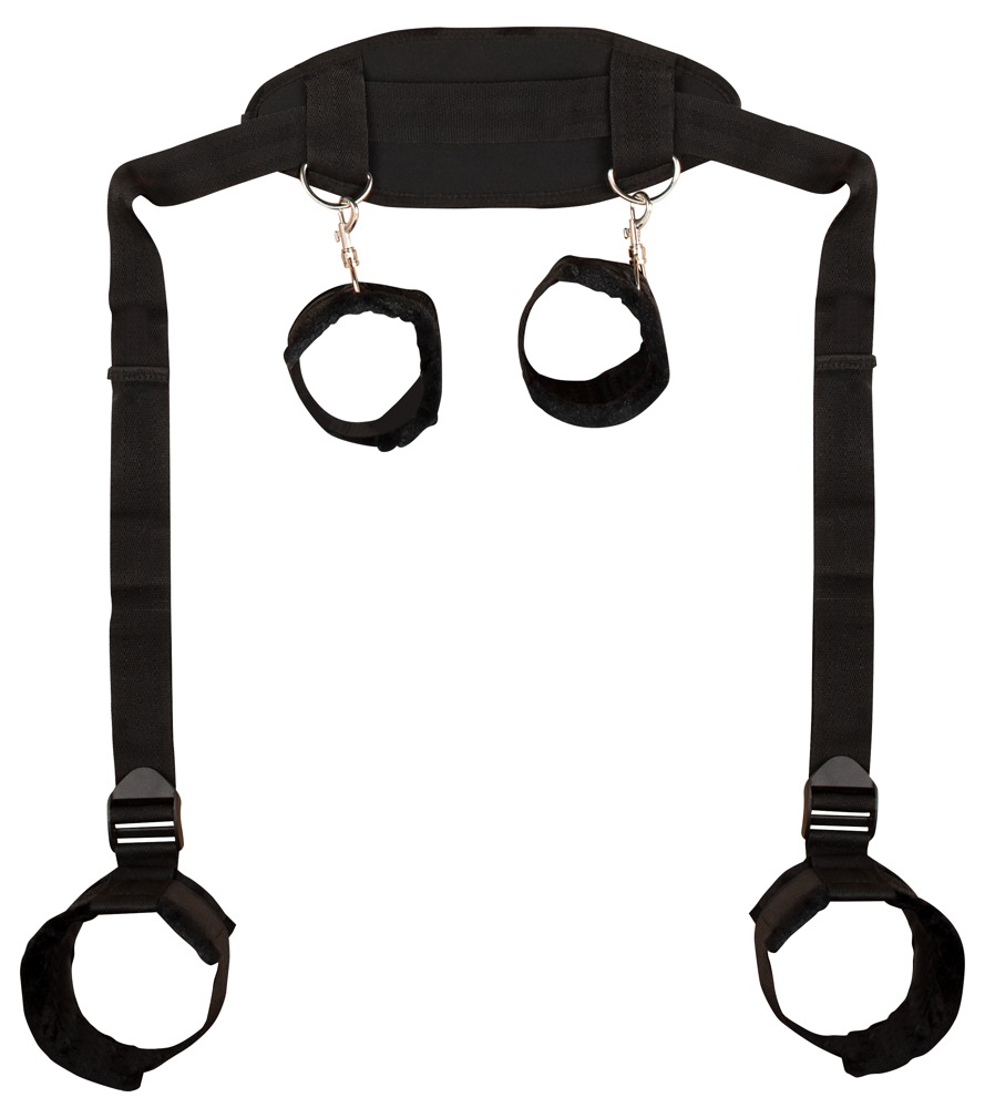 Attache combinée de Bad Kitty qui implique le cou/la nuque, les mains et les pieds. Les manchettes sont doublées de peluche douce à l'intérieur et réglables à l'aide de fermetures velcro robustes. La longueur des bandes de fixation des menottes de pieds est réglable. Les menottes peuvent être détachées de la manchette cou/nuque à l'aide de mousquetons. Masque pour les yeux inclus.