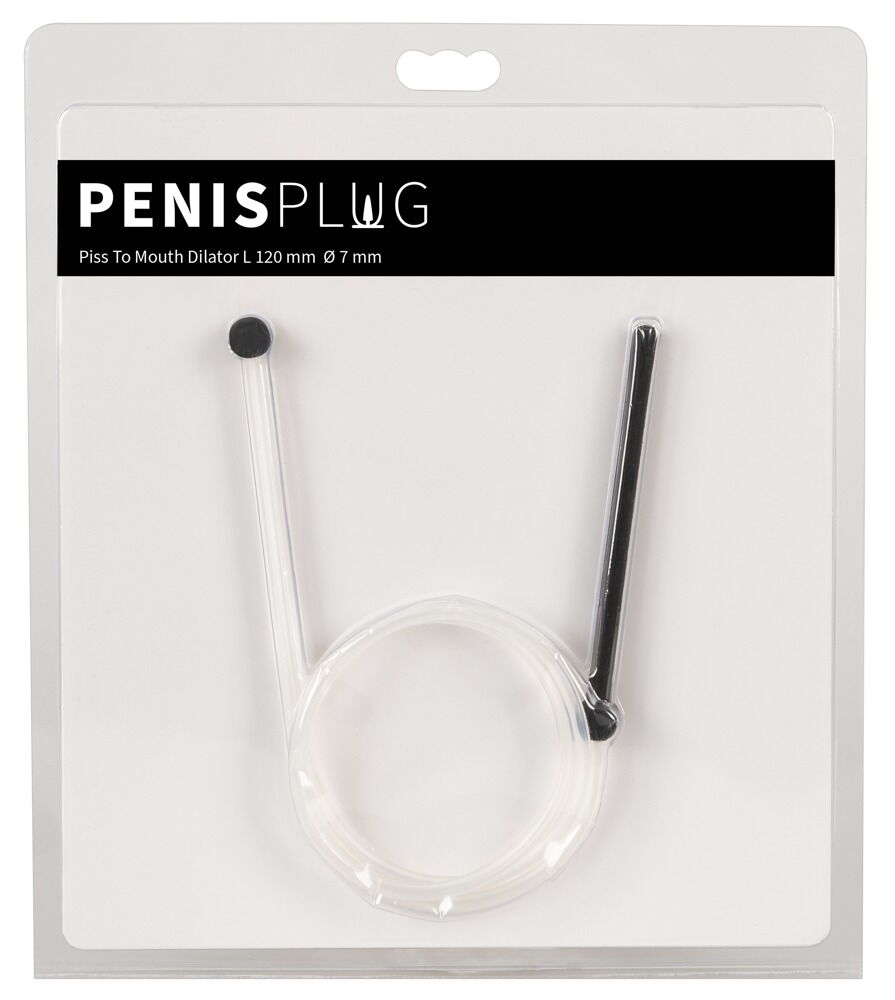 Hollow Piss To Mouth Dilator fra Penisplug med fastmonteret rør og mundstykke. Alt er problemfrit fremstillet og behageligt fleksibelt og elastisk til ubekymret leg og brug. Med 75 cm er det gennemsigtige rør langt nok (også) til selvsmagning.