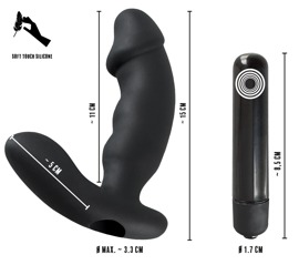 Gesamtlänge 15 cm, Einführtiefe 11 cm, Ø 2,7-3,3 cm. Perineumreizer 5 cm lang, Ø 2,5 cm. Silikon, ABS (mit PU-Überzug).