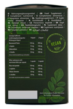 Dietary supplement Pure Moringa + Maca Man Power from HOT specifically for men that contains L-arginine, moringa, maca and Tribulus terrestris. Vegan.