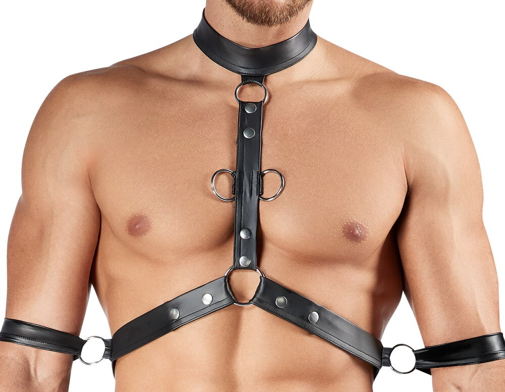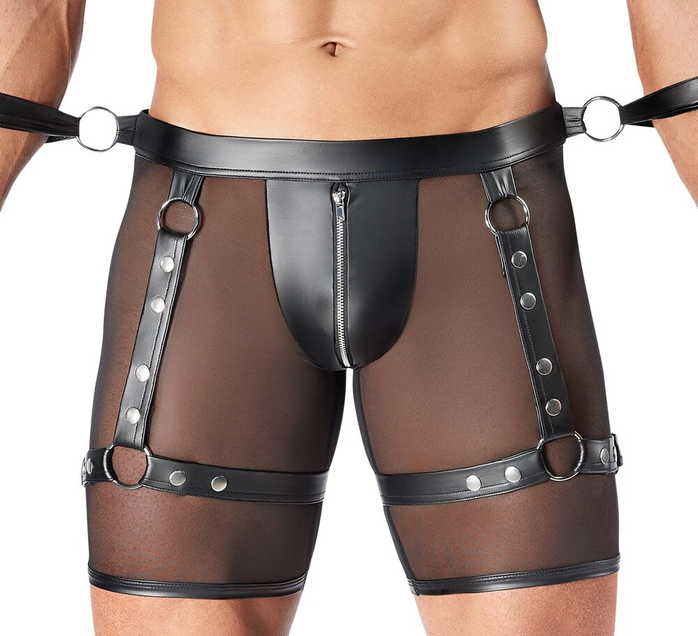 Harness pants, chest harness and 4 wrist/arm restraints in a black set from Svenjoyment BONDAGE. The pants are made out of soft and stretchy powernet and are in a shorts design. The pants are also wonderfully transparent with matte look details. The thigh harnesses are made out of matte look straps and rings. The matte look straps can be adjusted (press studs). There is a padded zip over the opaque pouch. The chest harness is also made out of matte look straps and rings. The matte look straps can also be adjusted (press studs). The included restraints can be looped through the various rings and attached to them with their hook and loop fasteners.