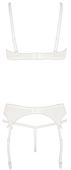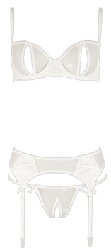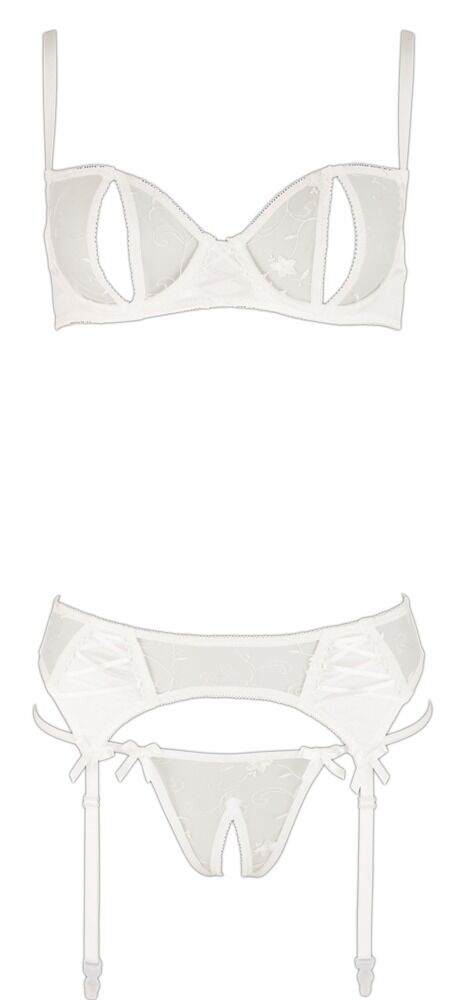Joli set blanc en résille fine délicatement brodée (Mesh) combinée avec du satin extensible et des petits laçages. Soutien-gorge à armature aux bonnets fendus, bretelles ajustables. Porte-jarretelles avec fermeture à agrafes dans le dos, jarretelles ajustables. String assorti ouvert à l'entrejambe inclus.