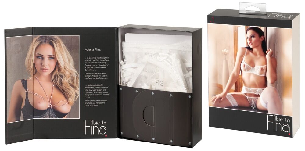 A primera vista una total inocencia, pero es todo lo contrario. Pues quien lleva lencería de Abierta Fina quiere sexo sin limites! Tirantes y ligas ajustables, cierre de gancho en la espalda, fina red bordada delicadamente en combinación con un satén elástico. 50% poliéster, 40% poliamida, 10% elastán. Tanga en malla fina 100% poliéster.