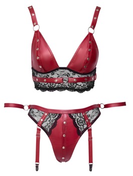 Bralette med stroppetruse fra Cottelli BONDAGE i rød mattlook med innsaser av edel svart blonde og sølvfargede pynteelementer. Braletten har forførerisk slissede skåler som lukkes med trykknapper. Stropper og belte under bysten kan justeres i perfekt passform. Trusa med strømpestropper er også åpen fra trekanten gjennom hele skrittet til baken og kan lukkes med trykknapper. I sida og bak har den ringer hvor lenkereimene kan festes (borrelås). Strømpestroppene er juster- og avtagbare