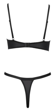 Reggiseno e perizoma con ferretto in un set nero di Cottelli LINGERIE. Coppe e stringhe anteriori in pizzo morbido ed elastico con occhielli decorativi color argento. Piccola allacciatura decorativa tra le coppe con ferretto. Chiusura con gancio regolabile sul retro. Anche le spalline sono regolabili per una perfetta vestibilità. Perizoma Rio con comoda fascia elastica in vita.