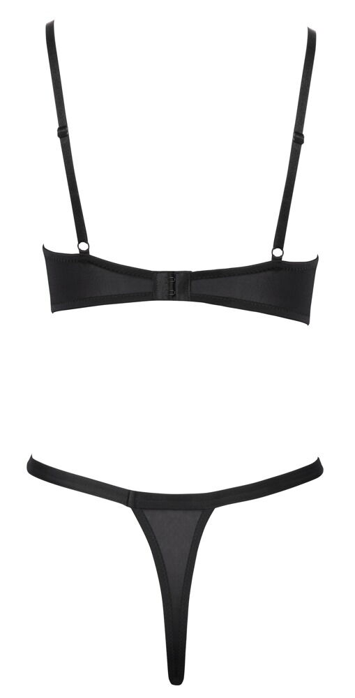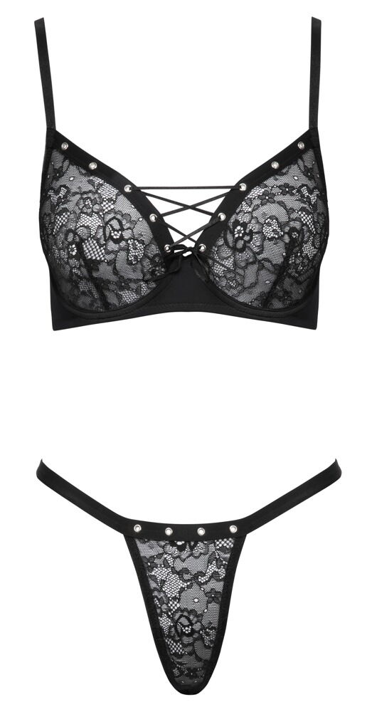 Bygelbehå och riostring i ett svart set från Cottelli LINGERIE. Kupor och stringfront av mjuk elastisk spets med snygga silverfärgade öljetter. En liten pyntsnörning mellan bygelkuporna. Baktill med justerbar hakknäppning. Även axelbanden kan justeras för bästa passform. Riostring med bekväm stretchlinning.