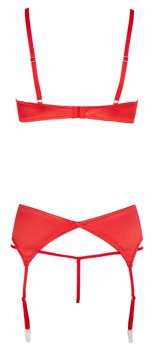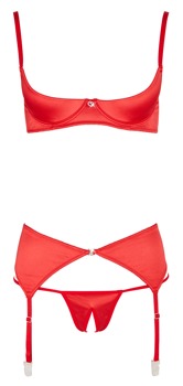 Czerwony jak miłość jest ten 3-częściowy zestaw, który składa się z biustonosza, pasa do pończoch i stringów. Biustonosz ma usztywniane fiszbiny, podszyte miseczki i zapięcie na haftki z tyłu. Ramiączka są regulowane. Pasek do szelek posiada zapięcie z przodu dla łatwego otwierania i cztery regulowane paski do szelek. Pasujące stringi są zachęcająco otwarte w kroku.