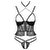 W tym zestawie marki Abierta Fina połączono longline bodice i figi bez krocza. Wszystko wykonane jest z delikatnej, miękkiej koronki elastycznej i ozdobione aksamitnymi paskami i detalami. Biustonosz o dłuższym kroju z lekko usztywnionymi miseczkami na fiszbinach wprowadza biust w szczytową formę i bezpośrednio w pole widzenia. Mała falbanka spłaszcza talię. Zamek błyskawiczny w kolorze srebrnym z przodu ułatwia zakładanie i zdejmowanie. Łańcuszki przy dekolcie i naszyjnik są odpinane od gorsetu. Ramiączka przy dekolcie oraz aksamitne ramiączka można dopasować do siebie. Koronkowa halka, sprytnie zaprojektowana z rozciągliwymi paskami z przodu, uwodzi otwartym kroczem i stymulującym łańcuchem w kroku, który można również usunąć.