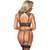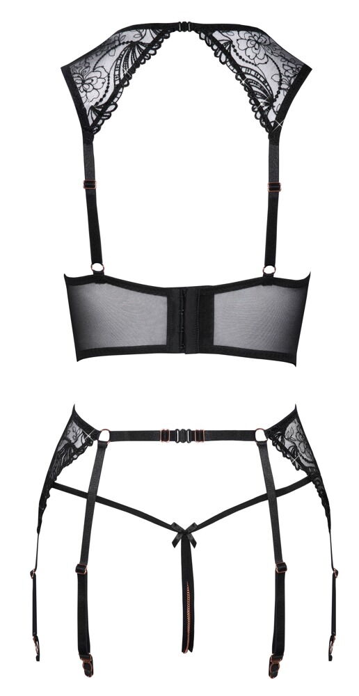 The open cup, bra top, suspender belt and crotchless string are in this elegant and erotic suspender set from Abierta Fina. The set is made out of delicate black tulle which has elaborate embroidery on it. The set also has small decorative sequins on it as well. The rose gold-coloured accessories add the finishing touch to this seductive style. The longer bra has lace covering the shoulders. There is a small fastener at the back of the neck. There is a hook fastener underneath the breasts that is decorated with sparkly rhinestones. The additional hook fastener at the back can be adjusted to fit. The front and the back of the bra straps can be adjusted too. The suspender belt also has a hook fastener at the back and 6 adjustable suspender straps (in total). There is a beautiful heart-shaped element at the front of the suspender belt. The small string is extremely seductive, thanks to its open crotch area and stimulating chain. The chain can be removed.