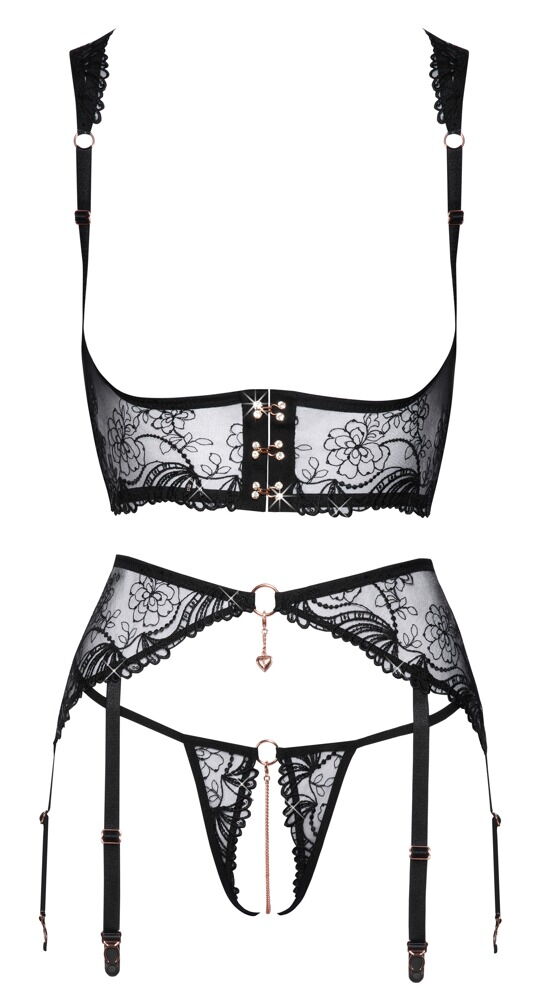 Sujetador sin busto, liguero y tanga sin entrepierna combinados en un conjunto de liguero elegantemente erótico de Abierta Fina. Confeccionado en fino tul negro, bordado y decorado con pequeñas lentejuelas. Los accesorios en color oro rosa completan el seductor estilo. Sujetador de corte más largo y busto descubierto con encaje que cubre los hombros. Pequeño cierre en la nuca. Cierre de corchete con brillantes bajo el pecho. Cierre de corchete adicional en la espalda y tirantes ajustables por delante y por detrás. Liguero con un bonito elemento decorativo de corazón delante, cierre de corchete detrás y un total de 6 tirantes ajustables. El pequeño string seduce con una entrepierna totalmente abierta y una estimulante cadena, que también se puede quitar.