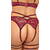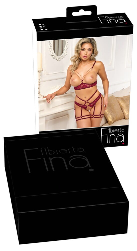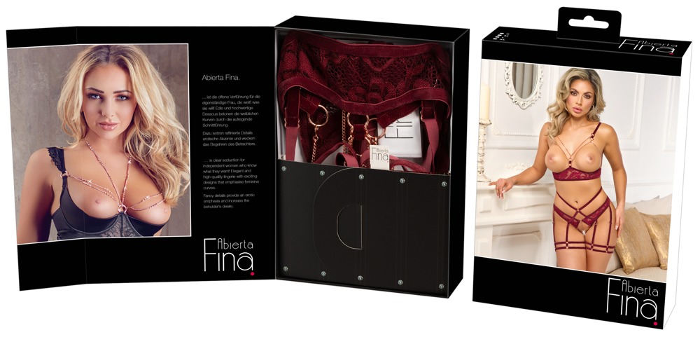 Aufregendes Set von Abierta Fina mit busenfreiem BH und Straps-Slip ouvert. Feine dunkelrote Spitze verführerisch in Szene gesetzt mit Samtbändern und roségoldfarbenen Accessoires. Rundum weich und elastisch für hohen Tragekomfort. Schmuckketten umrahmen die freiliegenden Brüste, 3 abnehmbare Kettchen im komplett offenen Schritt stimulieren bei jeder Bewegung. Die BH-Träger und der Hakenverschluss im Rücken sind passend verstellbar. Slip in Straps-Optik mit taillenhohem Samtband-Bund. Die Samt-Strapse mit den doppelten Schenkelriemen sind passend verstellbar.
