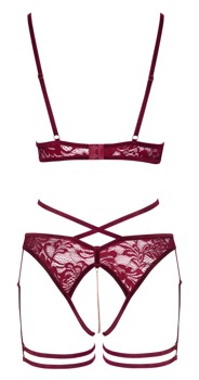 Opwindend setje van Abierta Fina met een bh zonder buste en een kruisloze jarretelslip. Fijn donkerrood kant verleidelijk afgezet met fluwelen linten en roségoudkleurige accessoires. Overal zacht en elastisch voor een hoog draagcomfort. Sieradenkettingen omlijsten de ontblote borsten, 3 afneembare kettingen in het volledig open kruis stimuleren bij elke beweging. De bh-bandjes en haakjessluiting op de rug kunnen op maat worden versteld. Jarretel-stijl slip met een taillehoge fluwelen tailleband. De fluwelen jarretelbandjes met dubbele dijbeenbandjes zijn op maat verstelbaar.