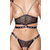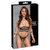 Zestaw Ouvert od Cottelli BONDAGE z topem odsłaniającym biust, majtkami bez krocza i dwoma miękkimi kajdankami. Stylowe połączenie delikatnej czarnej koronki z ciemnofioletowymi matowymi detalami i srebrnymi dodatkami. Top otacza nagie piersi łańcuszkami. Pas w talii na przednim pierścieniu można regulować za pomocą zatrzasków, podobnie jak ramiączka. Regulowane zapięcie na haftki z tyłu. Majtki z odpinanym, stymulującym łańcuszkiem w otwartym kroku. Regulowany pas z zatrzaskami. Mankiety można zaczepić do bocznych pierścieni w pasie za pomocą łańcuszków z karabińczykami. Miękkie mankiety na kostki można szybko założyć i zdjąć dzięki regulowanym zapięciom na rzepy.