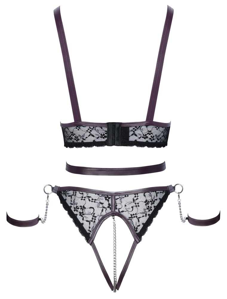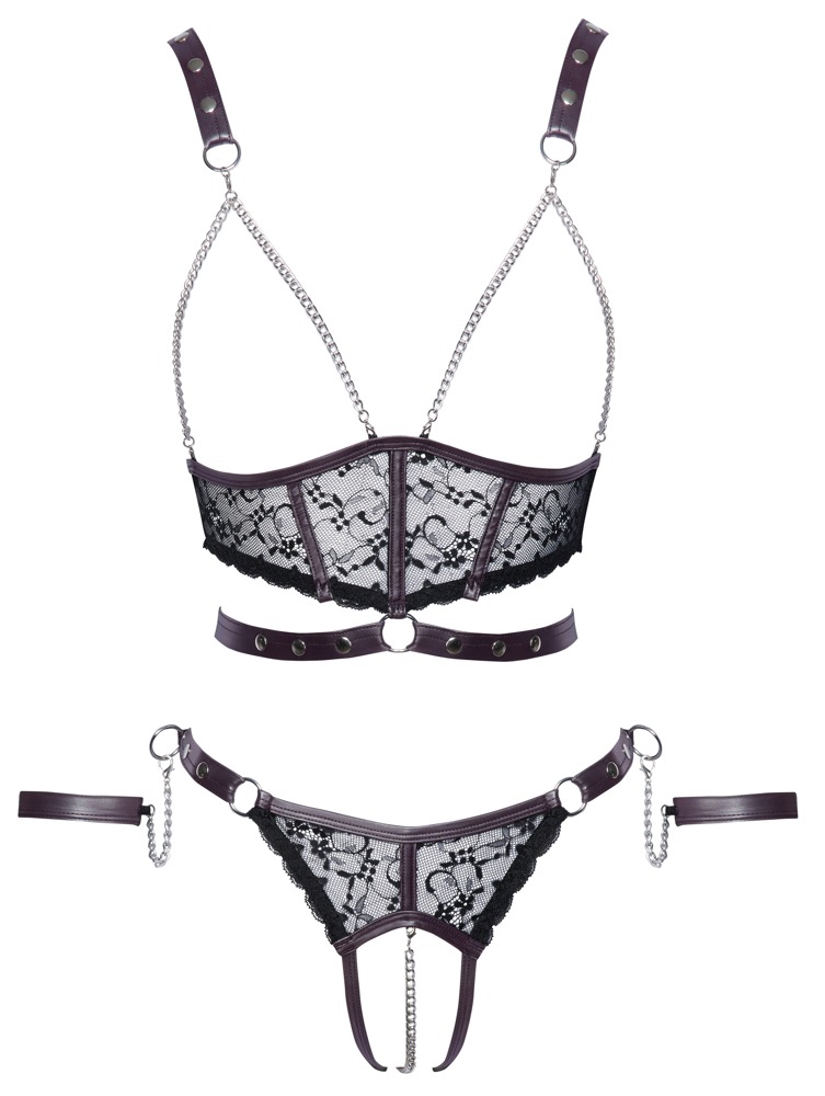 Öppet set från Cottelli BONDAGE bestående av bröstfri topp, öppen trosa och två mjuka handbojor. Snygg mix av fin svart spets och mörklila mattlookdetaljer och silverfärgade accessoirer. Toppen ramar in de bara brösten med kedjor. Midjebältet har tryckknappar, likaså axelbanden. Med justerbar hakknäppning baktill. Trosan har en avtagbar stimulerande kedja i den öppna grenen. Trosan kan justeras med tryckknappar på linningen. Bojorna kan hakas fast i midjebandens sidoringar med sina karbinhakekedjor. Bojorna har kardborrknäppning och kan justeras.