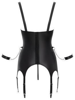 The exciting black set from Cottelli BONDAGE contains a basque, crotchless string and soft handcuffs. The set is made out of stylish matte look material with silver-coloured accessories. It is soft and stretchy for a very comfortable fit. The open cup basque has slightly padded, underwired cups. There are 2 restraint rings at the front with removable snap hook chains. There is a long, adjustable hook fastener at the back. The bra straps, with decorative press studs, can be adjusted. The 6 sewn-on suspender straps can also be adjusted to fit. The basque also has studded straps attached to either side of the waist and they have rings for the included handcuffs and their snap hook chains. The soft handcuffs can be put on quickly and adjusted to fit, thanks to their hook and loop fasteners. The crotchless matte look string completes the captivating look.